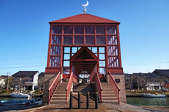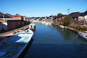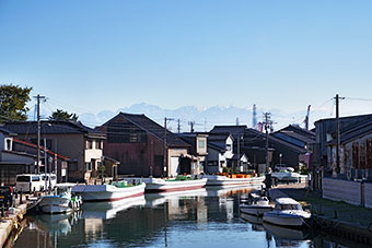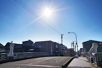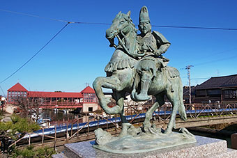 | 東橋から見る内川。 | 放生津橋袂のおんぞはん。 | 放生津橋の足利義材像。室町幕府十代将軍で、1493年、細川政元の反乱で放生津に逃れる。五年間をすごし、越中公方と呼ばれる政権を樹立。 |
