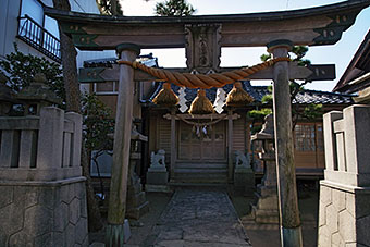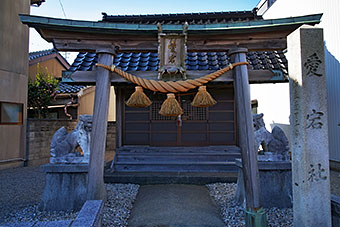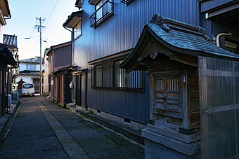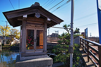 | 放生津八幡宮近くの神明宮。962年の創建で、かつては放生津三宮の一つだったとか。 | 八幡宮近くの天満宮。 | 道のあっちとこっちにあるおんぞはん。奥のものには寺町地蔵尊とありました。 |