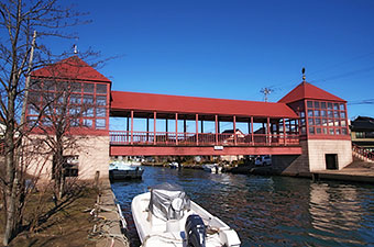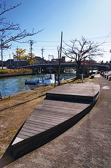 | 東橋。スペインの建築家セザール・ポルテラ設計の屋根付き橋で1992年のもの。 | 東橋袂にあった船型のベンチ。 | 東橋。1845年の大火で焼けて以来の再建?らしいです。 |