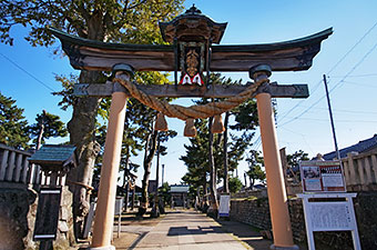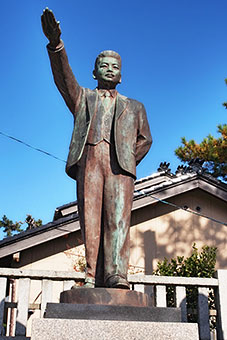 | 八幡宮前の卯尾田毅太郎(うおたきたろう)の像。この地の生まれで新湊町長などを経て衆議院議員になるも、1945年に空襲で亡くなった人。 | 放生津八幡宮の鳥居。746年に大伴家持が越中国司として赴任したときに奈呉の浦の風光を哀史、宇佐八幡を勧請して奈呉八幡宮としたのが始まりとか。 | これは霊松殿という御輿庫。1751年の建築。 |