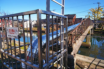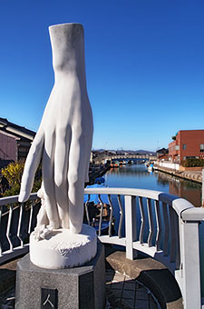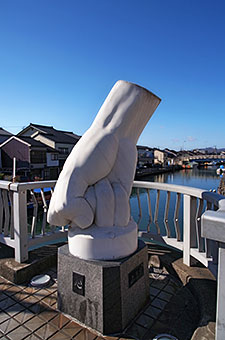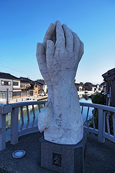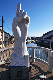 | これは放生津橋隣の水道管の橋。 | 今井竹材店とありました。 | 山王橋。地元出身の彫刻家竹田光幸制作の手の彫刻付き。 |