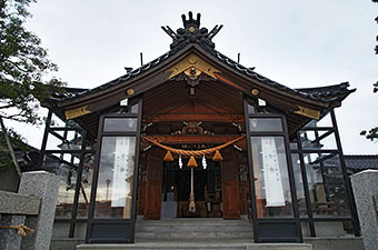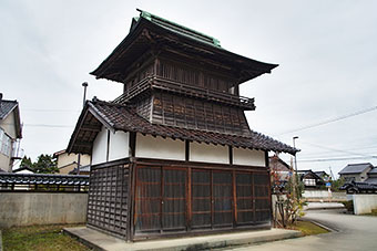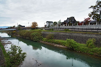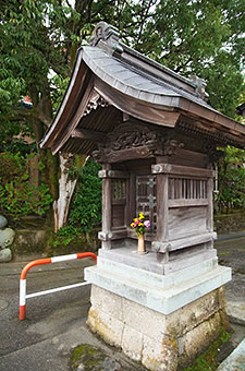 | 庄川と平行して流れる支流和田川脇の料亭か何かだったらしい建物。向かいにはコンクリですが現役の料亭があり、往時の繁栄を思わせます。 | 和田川と大門神社。大門曳山まつりというお祭りがあるそう。 | 大門神社。由緒は不明。社殿は新しいもの。大門曳山まつりは明治五年に始まったという比較的新しいもの。 |