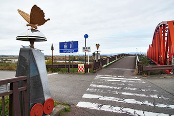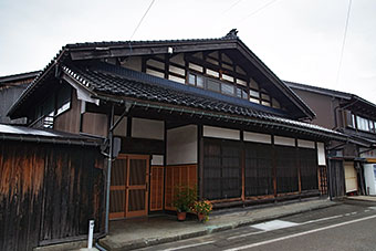 | 庄川にかかる大門大橋。親柱は曳山を模したもの。まつりではここを四台の曳山が渡るそう。五月には大凧をあげる越中だいもん凧まつりも。 | 大門の街並み。 | 鰻の寝床の奥行きのある家。 |
