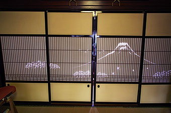 | 富士山が浮かび上がる凝ったふすま。 | こちらは銅板貼りの商家でしょうか。 | このおんぞはんには、奉斎防火祈祷堂とあります。 |