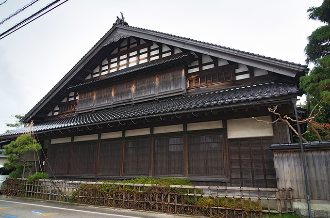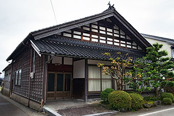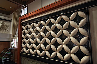 | 竹内源造作の恵比須・大黒と鶴亀。昭和五年の作品。 | これも竹内源造作の土蔵の二階窓扉。大正時代のもの。 | 同じく土蔵のなまこ壁。これも大正時代のもの。非常に美しい仕上がり。 |