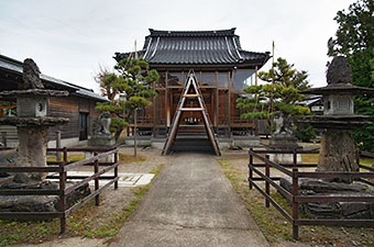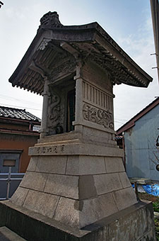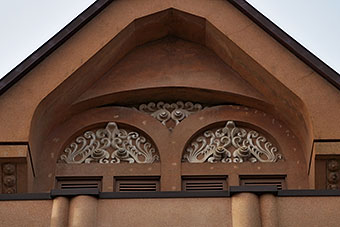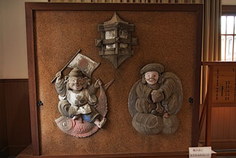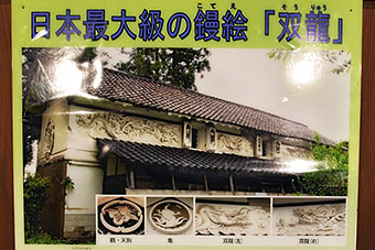 | ここにもおんぞはん。収められている内の一体の如来像は室町時代くらいのものとか。 | 竹内源造記念館は旧小杉町役場。1936年の建築。アカンサス模様は竹内源造の鏝絵。 | 竹内源造の手になる日本最大級の鏝絵『双龍』が正面に展示されています。 |