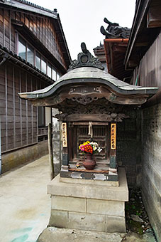 | 千本格子も美しい。 | 二口熊野社。1609年頃の創建。炎の中を駆け抜ける火渡り神事が今も行われているそう。自然石を使った灯篭は熊野の化け灯篭とも。 | こちらのおんぞはんには奉斎防火祈祷神璽とありました。後ろは消防団の屯所。 |