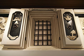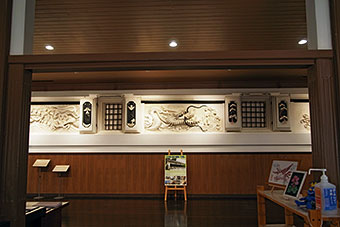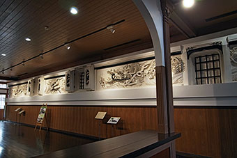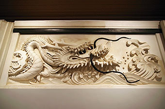 | 『双龍』は明治四十年代、二十代の竹内源造が三年かけて制作。横が17.5メートルもあります。 | 立体感あふれる龍の頭。目玉は玉眼。 | 扉には千鳥と波、滝など。 |