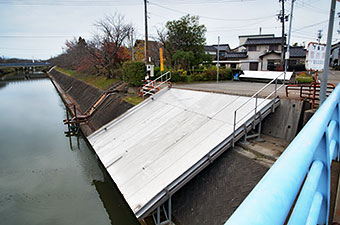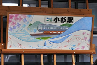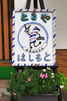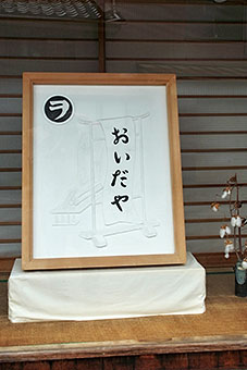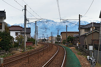 | 加賀藩旧本陣座敷。小杉新町の本陣だったものを大正十三年に加茂社社務所として移築。 | 踏み切りから見る立山連峰。 | 町中の店々には、鏝絵看板が飾ってあります。これは田舎(たなか)という割烹のもの。 |
