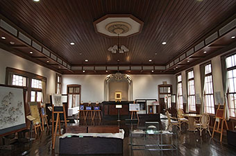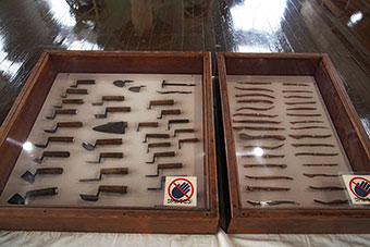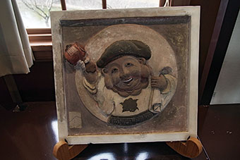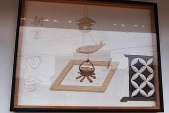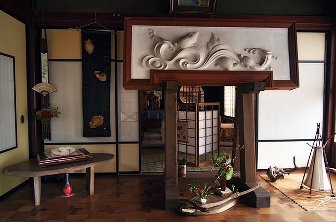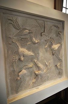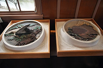 | 源造が使っていた鏝とへら。鏝は鏝絵用の特別なもの。 | 源造作の鳳凰。氷見市泉にあった上庄村役場の議場の天井を飾っていたもの。昭和二年の制作。 | 議長席上の鳳凰も源造の作品。昭和九年のもの。まるで石彫のよう。 |