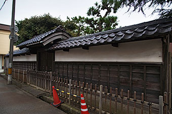 | 床屋さんです。 | 町中を流れる下条(げじょう)川の雪捨て場。 | 旧北陸道沿いの塀と門。小杉新町は1658年に三ケ(さんが)・戸破の二つの村にまたがる形で誕生。 |