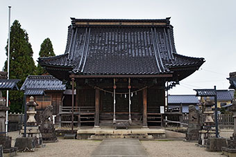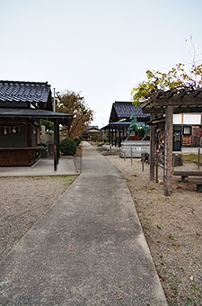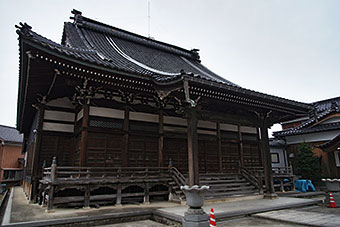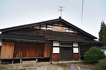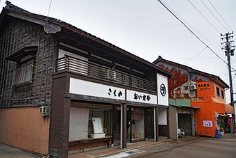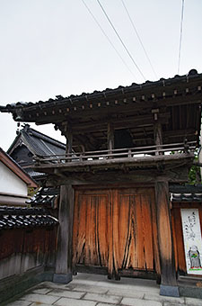 | 久證寺本堂。十八世紀の飢饉の時は、寺宝の親鸞絵像などを役人が借り受けて質入れし、藩への納入を完了したとか。 | 北陸道沿いに古めの店が残っています。これは呉服屋さん。 | その鏝絵。 |