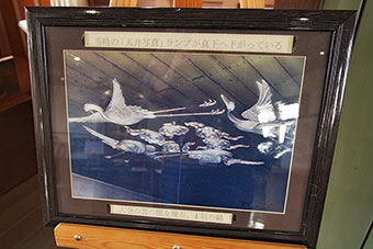 | これは源造の父勘吉作の鶴・亀。土蔵の妻飾りだったもの。 | 源造が昭和五年に制作した鶴と雲。薬品会社の吹き抜け天井にあったもの。 | 往時の写真です。 |
