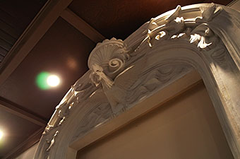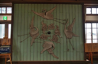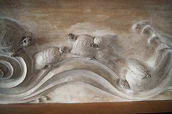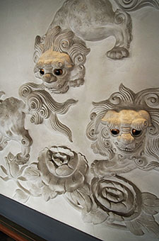 | 同じく薬品会社の吹き抜け天井まわりの長押しにあった亀と波。天井の鶴と対になっているものですね。 | 二階の議場を反対側から見る。 | 源造作の唐獅子牡丹。昭和四年のもの。射水市二口の個人宅にあったもの。あがらせてもらったお宅? |