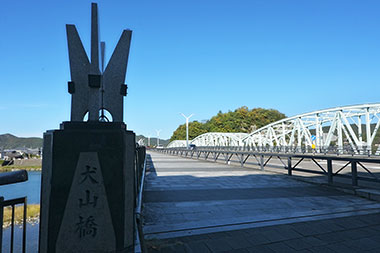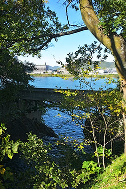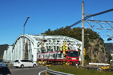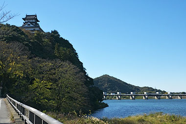 | こちらが車と歩行者用の犬山橋。 | 木曽川沿いに犬山城に向かいます。 | 犬山城の下に架かる彩雲橋。1929年竣工のアーチ橋。名鉄の古レールを用いて作られたそう。 |