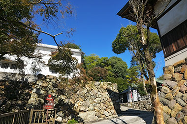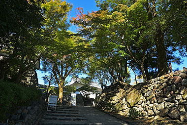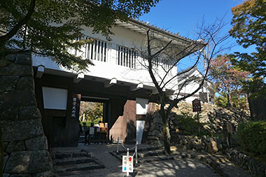 | 犬山城の大手道、黒門という門があったあたり。奥に見えるのは針綱神社。 | 鉄門(くろがねもん)が見えてきました。 | 鉄門は1965年の復元です。 |