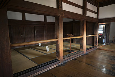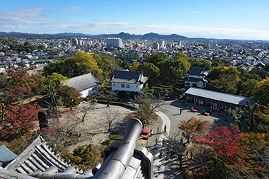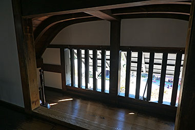 | 武具の間。武具を収める棚が並んでいます。 | 唐破風の間。築城時にはなくて江戸初期に装飾として作られたもの。 | 最上階からの眺め。これは城下町方面。 |