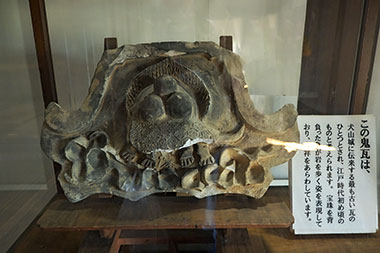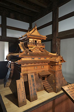 | 犬山城現存最古の鬼瓦。江戸初期のもので、亀が宝珠を背負っています。 | 上段の間。殿様が使う部屋で奥には武者隠しの間があって武士が待機していたそう。 | 飴色がきれいな天守の模型です。 |