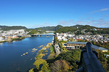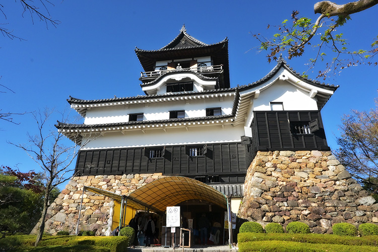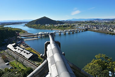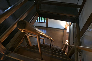 | 木曽川の川下を見る。明治二十四年の濃尾地震で壊れた城の修復を条件に二十八年に城主成瀬家へ県から無償譲渡され、以来2004年まで個人所有の城に。 | 川上方面を見る。犬山橋が見えます。 | 急な階段を見下ろす。ここを甲冑をつけて上り下りは大変そう。 |