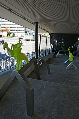 | 名鉄犬山遊園駅。かつては右側にモンキーパークに行くモノレールがありましたが、2008年に廃線。 | 改札前に桃太郎の犬・猿・雉の像ができていました。鼻の上にはきびだんご。 | 駅を出るとすぐ木曽川に架かる犬山橋。かつてはこの鉄橋を車も並走していました。2000年に平行する自動車用の橋ができて、今は鉄道専用。 |