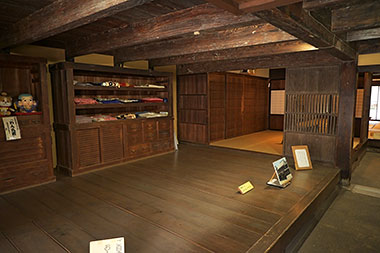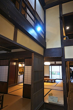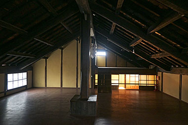 | 堀部家主屋の内部。右側に電話室があります。堀部家は代々城主に使えた士族で、養蚕に携わっていたそう。 | 右の剣道の道具は幕末のもの。 | 主屋の二階です。ここで養蚕を行っていたのでしょうか。 |