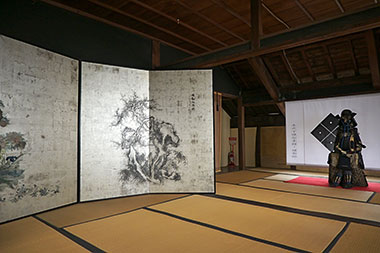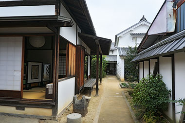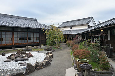 | 二階の座敷です。鎧に銀箔の屏風がありました。 | 主屋裏手の庭と離れ座敷、土蔵。離れは大正末から昭和初期のもの。 | すっきりした土蔵です。 |