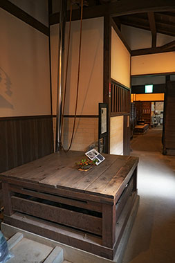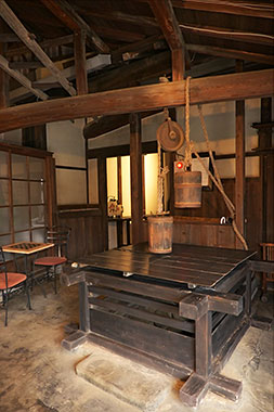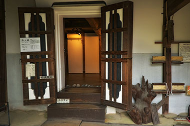 | 裏座敷は明治三年、右奥の土蔵は明治八年のもの。 | 裏座敷の内部です。 | 奥土蔵も明治八年の建築。扉右手前の古材は犬山城にあった杉の御神木の上部。枯死した時に切って保存したものだそう。 |