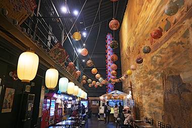 | 昭和横丁に入ってみました。右側の緞帳は愛知厚生年金会館にあったもので、1980年のもの。木曽川ライン下りを描いた岩澤重夫という日本画家が原画。 | ビルに建て替えられた稲城街道は数百メートルだけで、また古い町並みになります。 | 堀部家住宅。明治十六年建築。 |