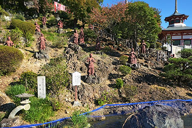 | 臥龍寺本堂は1679年の再建。 | 成田山名古屋別院大聖寺。通称犬山成田山。街灯には「青少年に愛の手を 人も車も交通安全」。かつてはモノレールの駅があったそう。 | 池のまわりの石仏たち。 |