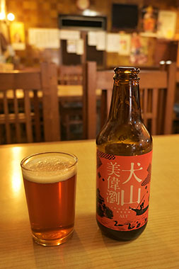 | 川を渡った先の妙感寺。1640年の創建、1668年にこの地へ。彼岸桜は樹齢三百年とか。本堂は新しいもの。 | お寺の裏には妙感寺古墳。五世紀前半のもの。 | 犬山駅前に戻り、松の里で飲んで帰路に着きました。これは犬山美偉瀏なり。作っているのは市内の盛田金しゃちビール。 |