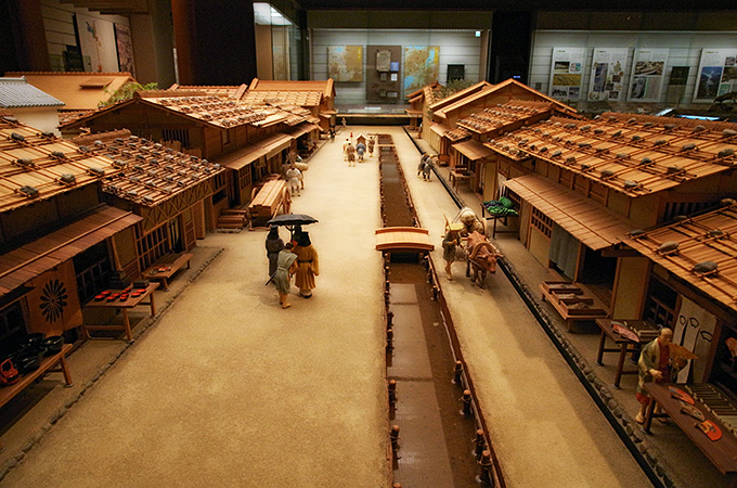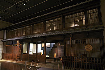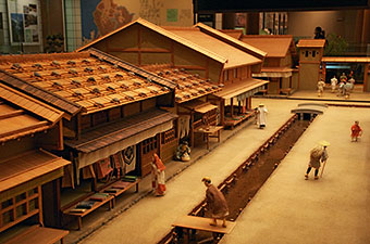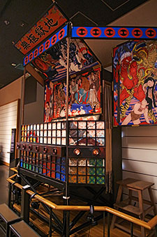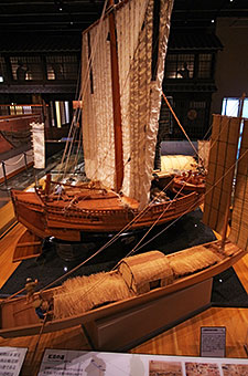 | 角屋という旅籠の再現。伊勢参りで賑わった三重の椋本宿の宿。なお、実物もまだ存在しています。 | ここから二日目。これはのぞきからくり。江戸から明治にかけて流行ったもの。穴をのぞくとレンズで拡大された絵があり、口上と共に変わっていきます。 | 北前船と川船。江戸時代の運輸の主役は船。 |