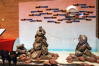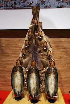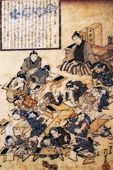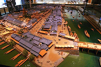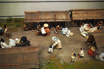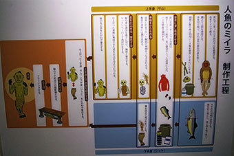 | 人魚のミイラの制作工程。上半身は猿で下半身は鮭。何とこれは江戸から明治には輸出されていたとか。 | 江戸時代の寺子屋の様子。他の絵でも、みんな大騒ぎ(笑)。 | 第三展示室は近世。これは日本橋付近の様子。 |