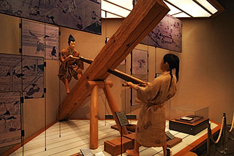 | いろいろな店が並ぶ戦国時代の京の都。 | 田楽装束。十四世紀から十六世紀、民衆が力をつけ芸能も生まれた時代の展示。右の人が持つびんざさらは体験用もありました。 | 大鋸(おが)引き。室町時代に中国から伝わった縦引き鋸。初めて製材が可能になったとか。 |