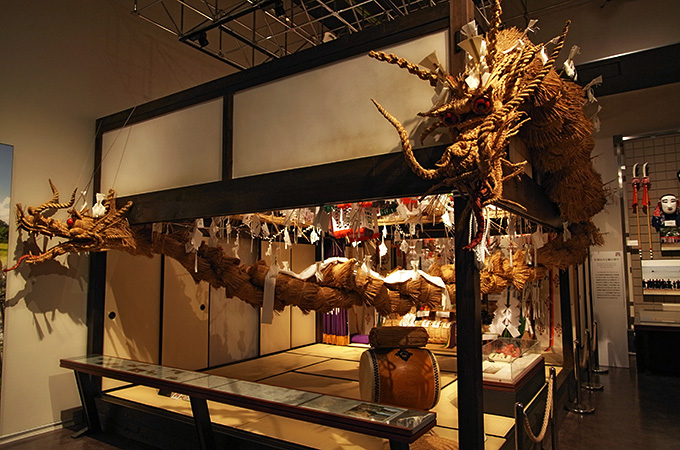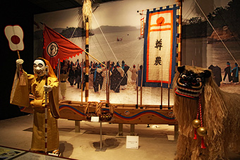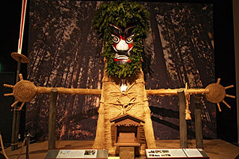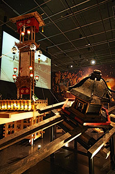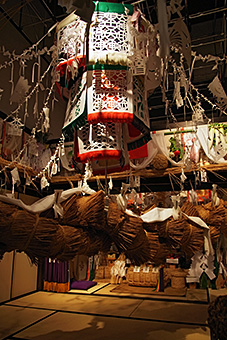 | 前回リニューアル中だった民俗の第四展示室。広島の比婆荒神神楽の神殿(こうどの)。圧倒される迫力。 | 沖縄の龍船競争。 | 石川は宇出津のあばれ祭。神輿を海や松明に投げ込む荒っぽいお祭。奥はキリコ。 |