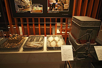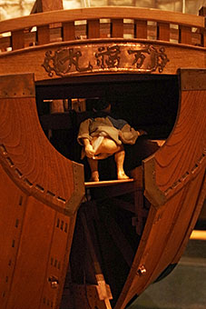 | 兵営の便所跡が残っていました。 | 馬出し空堀。駐屯地造営のため埋め立てられたものを復元したもの。元は倍くらい深かったそうです。 | 歴博に入りました。前回気付かなかったけど、北前船の船尾には用を足す人が。 |