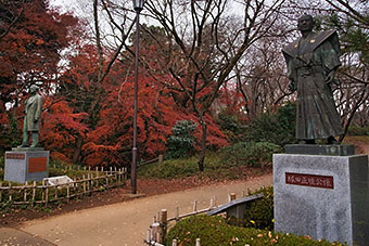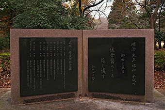 佐倉城址にある碑。明治七年から平成十六年までこの地にあった陸軍病院〜国立病院を記念するもの。 | 城址公園に立つ堀田正睦とアメリカ総領事タウンゼント・ハリスの像。日米修好通商条約の交渉をした二人です。 |