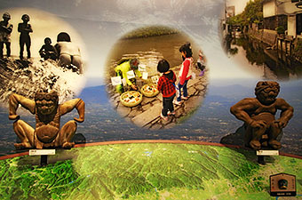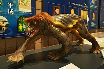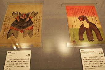 | 河童のコーナー。これは佐賀のもののようです。 | 江戸時代の河童の絵を元にしたもの。妙にリアル。 | 妖怪のコーナー。左は雷獣。大雷の時、落ちてきたとか。右は尼彦(あまびこ)という予言をする妖怪。どちらも熊本の伝承。 |