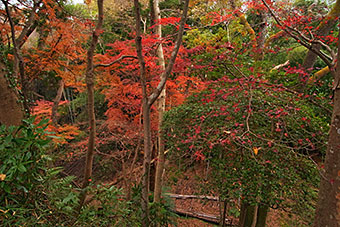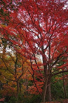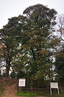| 天守跡から本丸を見る。植え込みで囲まれているのが天守の跡。 | 県の天然記念物だという夫婦モッコク。本丸の庭木だったらしいです。 | 紅葉がまだ残っていました。 |